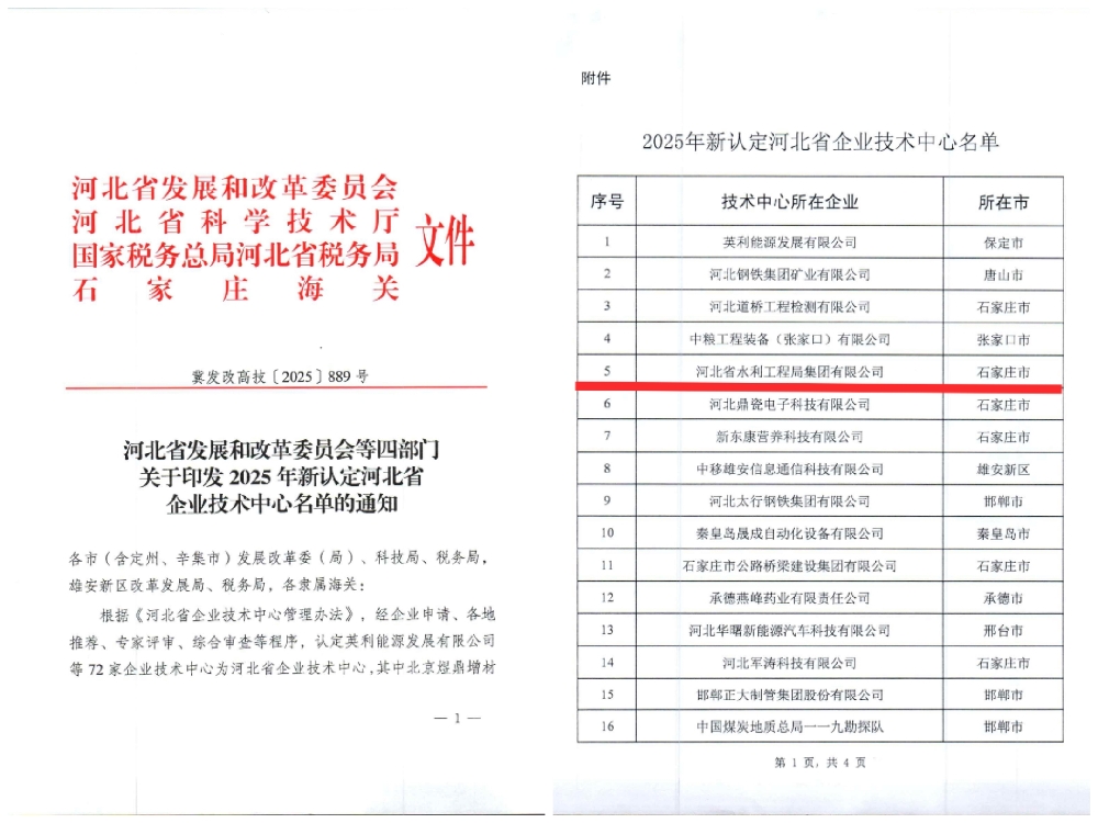 集團(tuán)水工局成功認(rèn)定河北省企業(yè)技術(shù)中心近日,河北省發(fā)展和改革委員會(huì)、河北省科學(xué)技術(shù)廳等四部門(mén)聯(lián)合發(fā)布2025年新認(rèn)定河北省企業(yè)技術(shù)中心名單,集團(tuán)水工局憑借卓越的技術(shù)創(chuàng)新能力與突出的業(yè)績(jī)表現(xiàn),成功認(rèn)定河北省企業(yè)技術(shù)中心。