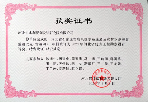 • 石家莊市鹿泉區(qū)水系連通及農(nóng)村水系綜合整治試點(diǎn)(古運(yùn)河)項(xiàng)目獲一等獎(jiǎng)