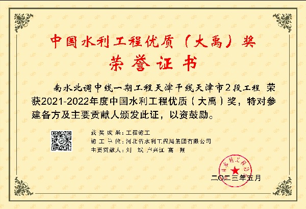 • 南水北調(diào)中線一期工程天津干線天津市2段工程榮獲大禹獎(jiǎng)