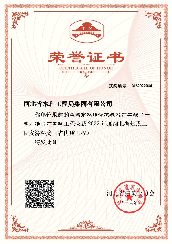 • 承德市雙峰寺地表水廠工程(一期)凈水廠工程榮獲安濟(jì)杯獎(jiǎng)