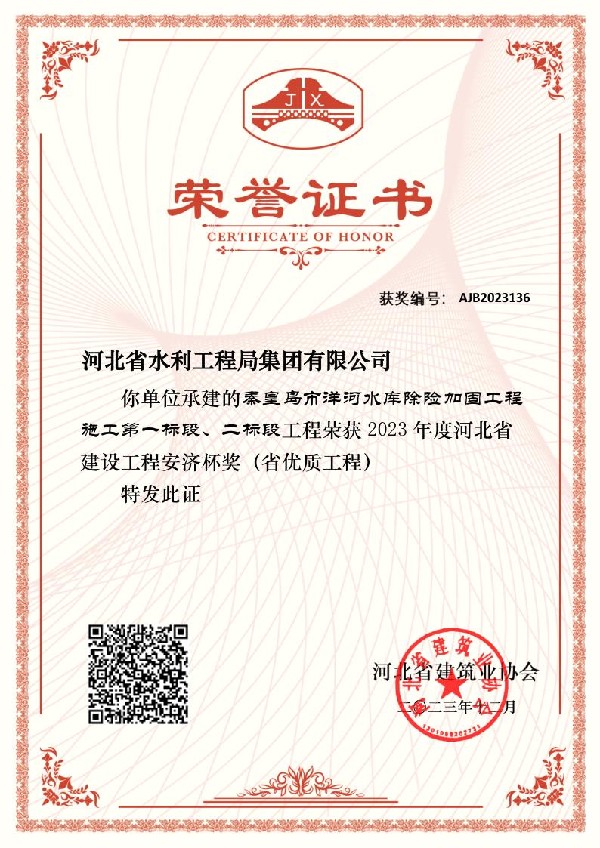 • 秦皇島市洋河水庫(kù)除險(xiǎn)加固工程施工一、二標(biāo)榮獲安濟(jì)杯