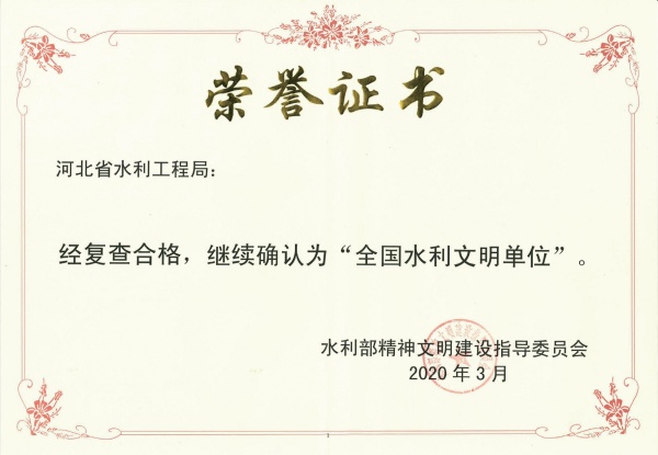 水工局以“育人興企,治水報(bào)國(guó)”為企業(yè)價(jià)值觀,踐行“忠實(shí)履約,精益求精”經(jīng)營(yíng)理念,在激烈的市場(chǎng)競(jìng)爭(zhēng)中潛心打造品牌。先后榮獲“全國(guó)文明單位”“全國(guó)水利系統(tǒng)文明單位”“全國(guó)優(yōu)秀水利企業(yè)”“全國(guó)水利建設(shè)市場(chǎng)‘AAA’級(jí)施工單位”“全國(guó)水利建設(shè)與管理先進(jìn)集體”“河北省建筑業(yè)先進(jìn)企業(yè)”“河北服務(wù)業(yè)企業(yè)100強(qiáng)”等榮譽(yù)稱號(hào)。